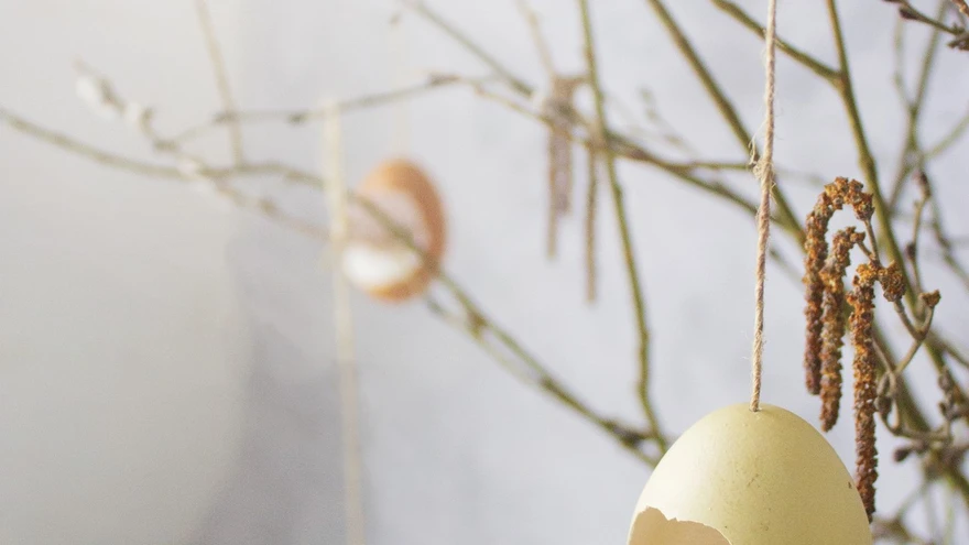 Lihtne munakoortest kaunistus pühadelauale. | foto: Laura KarroMunadepühade ajal kaunistatakse toad nartsisside ja pajudega. Riputa okstele ka munakoortest tehtud pesad, kuhu peita väikeseid komme.