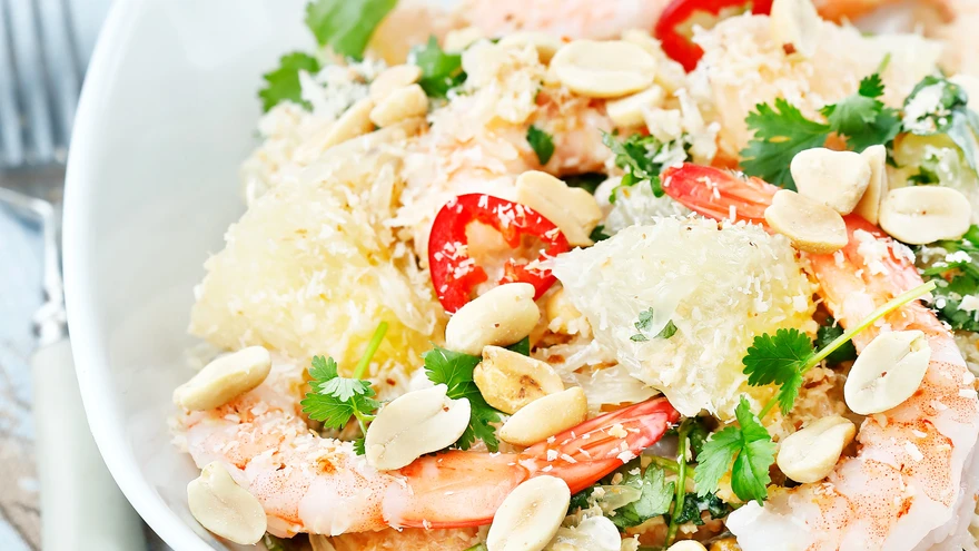 Selles populaarses Tai salatis on pomeli kaaslasteks kookoshelbed ja krevetid.