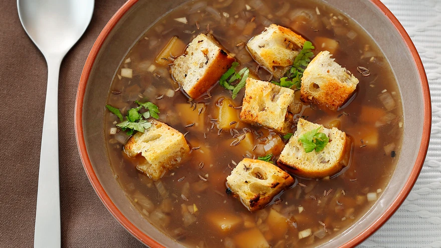 serveerimiseks krutoone ehk võis või õlis praetud saia- või nisuleivakuubikuid