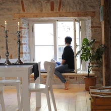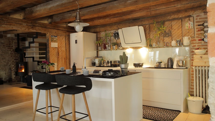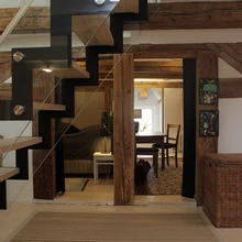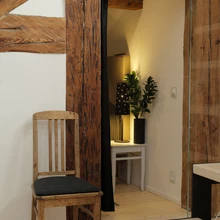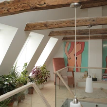 Ka sisekujunduslahendused ja korteri planeering on omanike endi mõttetöö vili. „Me oleme kõik ise teinud, ise disaininud,” ütleb Tiina ja jääb tagasihoidlikult mõttesse, et palju polnudki tegelikult võimalik disainida, sest piirid olid ette antud. Kasutada tuli seda, mis oli olemas. Alumise korruse põrand näiteks on mitmel tasapinnal – nimelt olid põrandad nii viltu, et kui neid ühtlaselt sirgeks ajada, kannataks ruumi kõrgus. Kui väljavahetamist vajavate talade asemele otsiti sarnaseid, kirvega käsitsi tahutud palke, siis põrandalauad on uhkelt uued, ainult et laiad nagu vanasti.