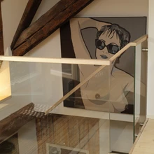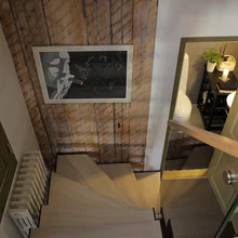 Läbi õhulise trepi ekslev pilk jääb pidama seinas ilutsevatel puittaladel. Seinad on iseloomuga ja väga kõnekad. Siiski sobitub trepi kõrvale seinale ka Tiina tütre Marian Eespäeva maal – emast emale sünnipäevaks.