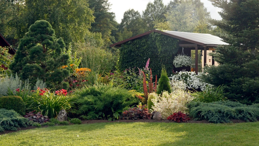 Vaheldusrikkad istutused. Madalad ja kõrged okaspuuvormid, sekka värvikaid põõsaid ja püsikuid kirjule istutusalale sobivate korduste ja aktsentidega. | foto: Tiina TammetIris ja Väino Rajasaare koduaed Järvakandis võlub maitsekalt kujundatud ja hästi hooldatud aiaruumiga, kus leidub kauneid taimi ning humoorikat lähenemistki. Aed võitis konkursil Kodu Kauniks "Aasta aed 2015" tiitli.