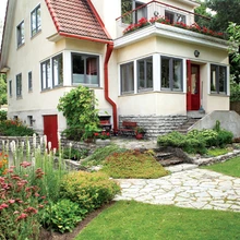 Hea on ka maja paigutus kitsal krundil: põhjaküljelt sisenedes ei varja hoone terrassile ja aiale paistvat lõunapäikest ning ka suurte puude vari jätab õhtupäikesele piisava ligipääsu. Eesaias ja külgaedades on mõned meetrid naabrini ja kitsas ligipääs tagaaeda, kus aga avar muruplats, mida raamistavad istutusalad koos grillimaja ja garaaži-hobiruumiga. Üle kõige on kaunis vaade terrassilt aeda ning sealt tagasi terrassiesisele kiviktaimlale.