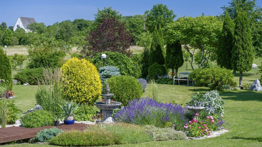 Ümbritsev maastik on oskuslikult aiakujundusse integreeritud. Vaadet taamal olevale Muhu Liiva kirikule hoitakse lahti elupuude vormipügamisega. | foto: Kalmer SaarSaare naise kohta öeldakse, et ta suudab toita mehe ja seitse last. Vähe sellest – Saaremaalt pärit Aire suutis pere ja töö kõrvalt luua ka silmapaistva aia, mis isegi presidendi tunnustusega märgitud, ning talviti jäädvustab ta Muhu lilleilu, tikkides seda rõivastele ja tekkidele.
