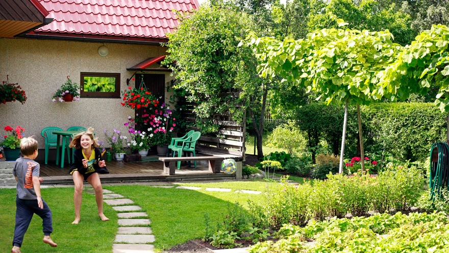 Lapselaste mängulustiks on aiaruumi piisavalt. | foto: Tiina TammetAastakümneid südamega haritud aianduskrunt õitseb ja kannab saaki. Perekond Heina aed Suurupis kiidab tegijaid: Reet ja Enn Heina aed pälvis „Kodu kauniks 2016” võistlusel finalistitiitli.