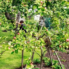 Kunagisest kümnest õunapuust on alles vaid mõned sordid: ’Valge klaarõun’, ’Koit’, ’Sügisdessert, ’Talvenauding’ ja kaks ’Suhkruploomi’. Puude varjus olevat võrkkiike kannab Ennu keevitatud toekas torustik ning sellel on lastel julge turnida. Juba kannab vilja ka ’Kuldreneti’, ’Sõstraroosa’ ja ’Make’ sortidega perepuu, mida nõrga kasvu tõttu peab korralikult toestama. Aia ääres kasvab lopsakas vaarikate rida, mõned sõstra- ning tikripõõsad ja eraldi mustikad. Tõstetud peenardel valmivad suvikõrvitsad, paprikad ja oad. Enam Reet suur hoidistaja ei ole, palju süüakse kohe hooajal, kuid natuke saab ikka ka talveks sisse tehtud.