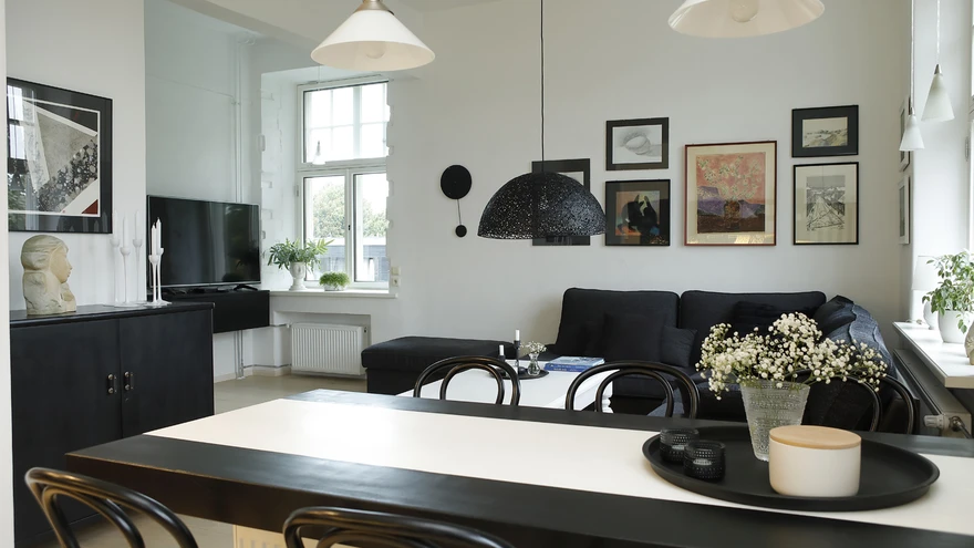 Konkursi „Kodu kauniks 2021” finalist. | foto: Juta KübarseppMaja, milles asuva korteri Tiiu Järv stiilselt mustvalgeks kujundas ja samades toonides sisustas, on 110 aastat vana. „25 neist oleme veetnud koos,” nendib Tiiu.