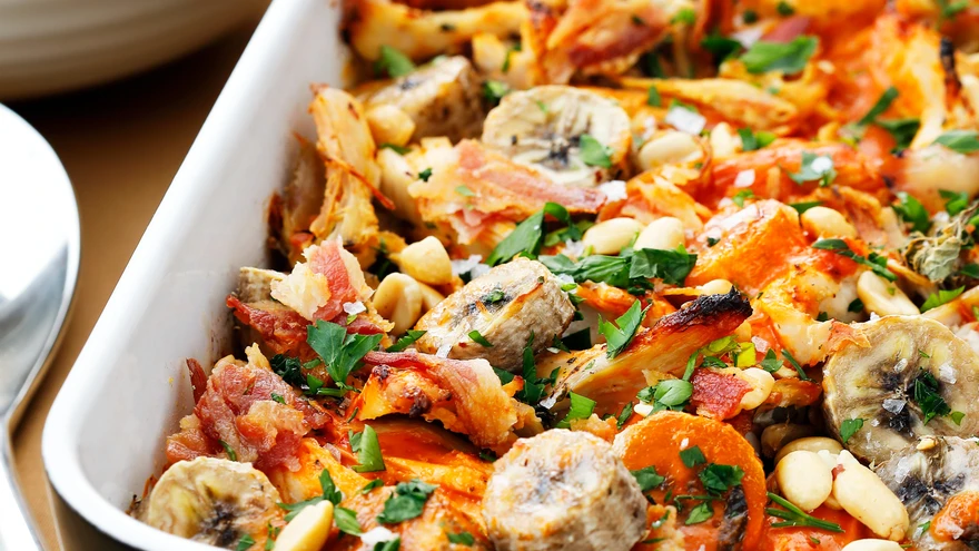 Koori banaanid ja lõika viiludeks. Laota kanatükkidele.