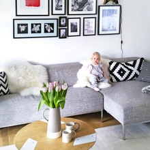 Meie kodus on valdavaks põhjamaine lihtsus. Heledad toonid: valge, hall, hele puit. Minu kindel soob ja plaan oli elutoa pildisein. Selle teostamine võttis omajagu planeerimist, mõõtmist ja arvestamist. Kõigepealt panin paika ala, kuhu tahtsin raame paigutada, siis pidin leidma vajalike kujudega enam-vähem ühesugused pildiraamid, et see seinaala nendega täita.