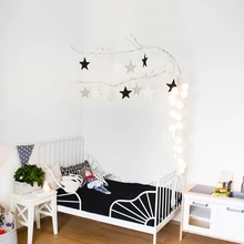Põhiline sisustamine võttis ainult pool aastat (kolm kuud enne sissekolimist ja kolm kuud juba korteris elades), sest mul oli tohutu soov kodu ruttu elamiseks valmis saada. Mõned asjad aga lisanduvad jooksvalt. Näiteks kasvas meie tütar beebivoodist välja ja oli aeg tema tuppa mõnus magamisnurk kujundada. Kuna me rohkem puurimisega tegeleda ei tahtnud, siis mõtlesin, kuidas oleks võimalik tema magamisnurk võimalikult hubaseks kujundada ilma asju seinale paigutamata. Lastetubade pilte sirvides olid silma jäänud puuoksad sisustuselemendina. Otsustasin, et paneme tema voodi kohale ka oksa, mille külge oleks võimalik midagi ilusat riputada.
