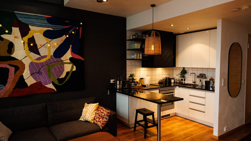 Elutoa must matt sein toob muidu avarasse korterisse sügavust. | foto: Stanislav MoškovLutheri kvartali katusekorteris ootab ees pealtnäha mittetajutav vastuolu. See on soojust täis tehasehoone. Seal on ka suured aknad ja avarad ruumid, kuid perenaine armastab hoopis hämarust. Planeeritud minimalistlikust kodust on saanud värviline elamine. Nimekirja võiks jätkata, kuid õigem on sisse astuda ja veenduda ise!
