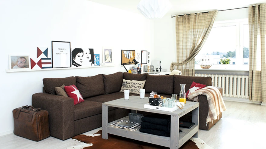 Kogu mööbel sai tehtud või ostetud just selle korteri jaoks. Esimeseks ostuks, mille ümber elutoas kõik muu kavandati, oli suur pruun nurgadiivan. „See polnud võib-olla kõige paremini läbi mõeldud valik ja tahab enda asemele midagi muud,” ütleb Rene praegu. Ainuke nostalgiline ese, mille pererahvas oma uude koju lubas, on väikest lauaplaati toetama paigaldatud Singeri õmblusmasina jalad.