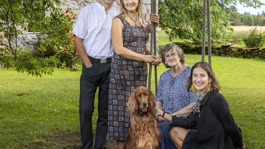 Vanaema Aita hüppab kiigele istuma ja pere on hopsti ümber – Anu koos elukaaslase Reino ja tütar Anna-Mariaga. Terrygi võtab sisse neti poosi. | foto: Toomas Tuul„Meilt on juba selline lennult võte ajakirja tehtud!“ hüüatab Paju talu pererahvas, kui fotograaf drooni õue kohale õhku saadab. „1930-ndatel ja kanamaja katuselt.“