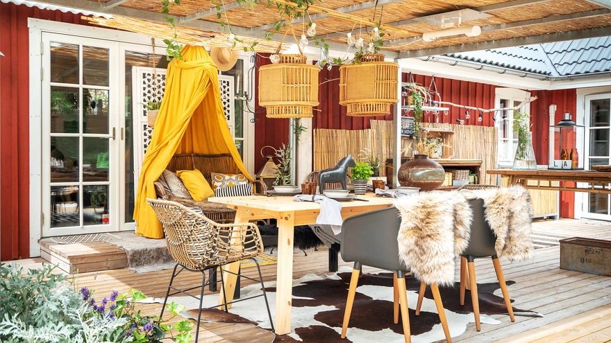 Jõuline kollane koos punutistega loob eksootilise puhkuse meeleolu. Nahad põrandal ja Dalarna hobused annavad aga rootsipärast õhustikku. | Camilla Isaksson / Living4media