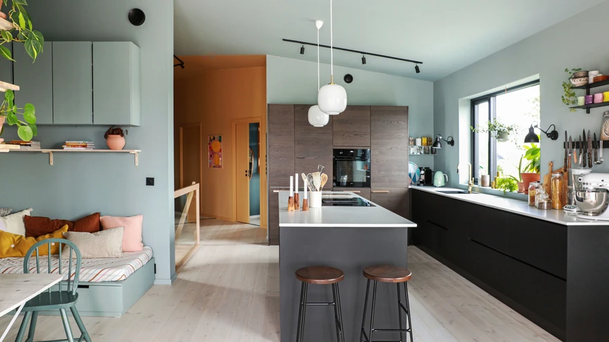 Lagede ja seinte toonid on nõnda varjundirohked, et neid saab nimetada mitut moodi. Hallist mündini. | foto: Annette Nordstrom, living4mediaIngridi ja Vidari perele oli 2020. aasta väga eriline. Pandeemia ajal jäid nad mõlemad kodukontorisse. Selles oli positiivsetki – samal ajal ehitati kohe üle õue nende uut maja, mille kerkimist nad nüüd lähedalt jälgida said.