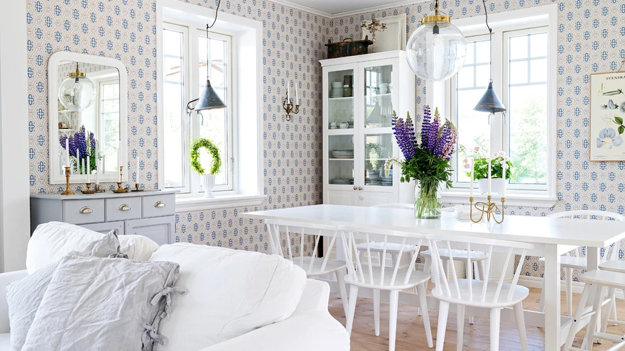 Pere valis seinale kohaliku tootja tapeedi, ajaloolise Boråstapeteri Anno sarja Pigkammareni (Eestis vt tapeet.ee). | foto: Cecilia MöllerMaria ja Pontus soovisid elada maamajas, mis pärineks eelmise sajandi vahetusest. Et aga isegi pikkade otsingutega sobivat ei leitud, tuli see ehitada.