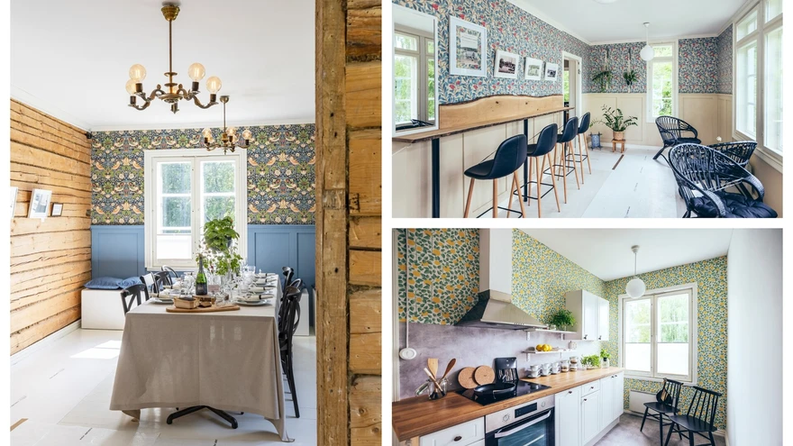 Kollaaž | foto: Auntomessut.fi ja Priit Grepp1928. aastal ehitatud hoone, kohaliku saeveski juhataja kodu ja kontori praegune lugu sai alguse ühest hommikukohvist ajalehe saatel. Koha praegune perenaine Tarja nägi lehekuulutust, mis innustas teda koos kaasa Jussiga kohvrid pakkima, et pühenduda täiesti uuele kodule.
