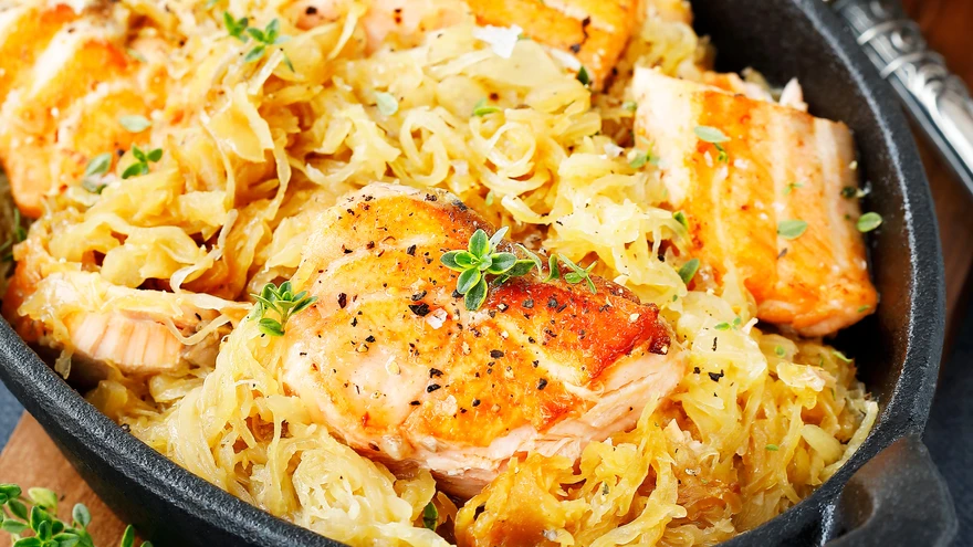 Tõsta kalatükid potti hapukapsa peale ning sega hästi ettevaatlikult. Kontrolli, et potis oleks veel veidi vedelikku. Hauta veel 10–15 minutit.