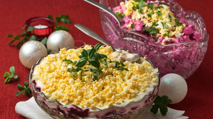 | foto: Jaan HeinmaaRosolje ei saa ometi pidulaualt puududa! Rikkaliku maitse ja kauni värviga salat ju ehib jõululauda. Heeringa asemel võib salatisse panna liha või valmistada toidu hoopis taimsena. Klassikaline kihiline salat kasukas köögiviljade ja soolaheeringaga passib peolauale imehästi. Salati võiks valmis teha eelmisel päeval, et see jõuaks piisavalt läbi imbuda.