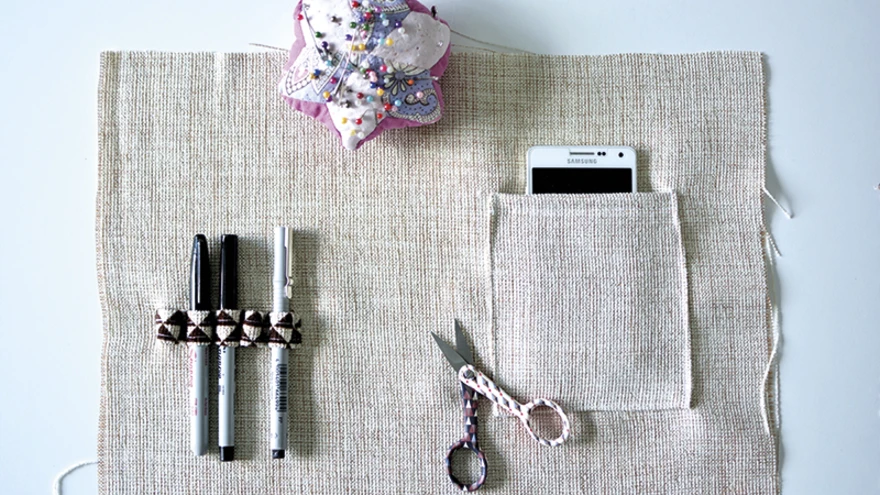 - Kinnita kõik väiksed taskud ja pliiatsitasku tumba kattekanga detailide külge sobivatele kohtadele (arvesta ka õmblusvaruga). Väiksemad taskud ja pliiatsitasku võivad jääda ka suurte taskute sisse peitu – nii on asju mugavam leida, kuid üldpilt on puhtam.