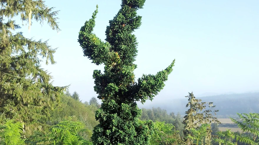 Ühetüvelisel sordil ’Wissel’s Saguaro’ ilmuvad täiesti juhuslikesse kohtadesse horisontaalsed võraoksad, mille tipud pöörduvad ülespoole. | foto: Jüri AnnistSkulpturaalse kujuga kalifornia ebaküpress ’Wissel’s Saguaro’ meenutab veidi sammaskaktust ja tekitab aias üksjagu elevust.
