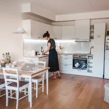 „Eks kodus katsetan asju, mis koolitundideski kasuks tuleksid, pead ju õpetajana nutikas olema, et suudaksid õpilasi kaasa haarata,” tõdeb ta. „Elutoa ja magamistoa mõnusate orvadega valged kapid on Ikeast, tundusid praktilised ja hästi sobivat. Elutoa kapil oleva väikse lambi panin ise osadest kokku. Põrandalamp pärineb K-Rautast.”