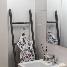 Vannituba on lihtne, kuid tänu Hemtexi lillelistele kardinatele ja rätikutele mõjub väike ruum mõnusa lilleaiana. Loodust aitab meeles hoida ka naturaalsest puidust rätikuhoidja.