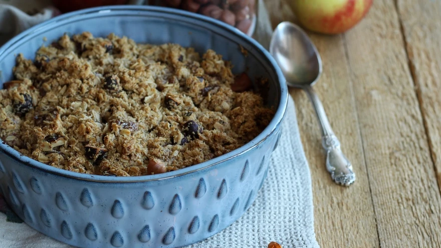 Krõbedik saab tänu täisterakaerahelvestele ja kliidele ka kiudainerikas. | foto: Kristi RebaneSellele kodusele krõbedikule annavad vunki juurde mahe iiris, kardemon ja krõmpsud metspähklid. Krõbedik saab tänu täisterakaerahelvestele ja kliidele ka kiudainerikas. Kindlaks ajaks magustoitu valmistades võid ahjuvalmis vormi ka külmkappi jätta ning õigel ajal ahju pista, et hõrk maius täpselt magustoidu söömise ajaks valmis saaks.