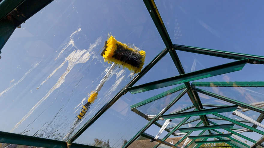 2. Esmalt uha kasvuhoone nii väljast kui seest veega korralikult üle. Nii vabaned lahtisest mustusest, tolmust ja liivast. Kasuta veevoolikut või survepesurit.
