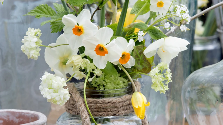 Nartsissid vaasis | foto: Modeste Herwig / Living4mediaÕuelaua vaasid kipuvad tuulega lendu ja ilmastiku käes määrduma. Soodne on sellesse rolli panna klaaspurgid.