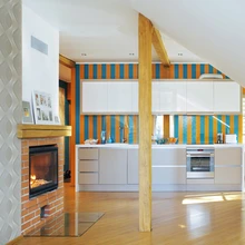 Kodu muudavad hubasemaks korteris asuv kamin ja puitpõrand. | foto: Juta KübarseppKeset Kalamaja on ühe vana armsa saja-aastase puumaja katusekorrusele ehitatud korteris peidus üks värvirõõmus köök. Et päeval paistab läbi suure akna katusekorrusel asuvasse korterisse ka päike, mis paneb erksad värvid särama, siis mõjub ruum kui tõeline värvivitamiin.