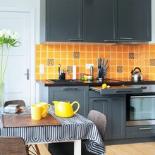 Ühtaegu värskelt uhiuuena ja diskreetselt traditsioonilisena mõjuv köök oli varasemalt kasutusel vaid pesuköögina ja toiduvalmistamiseks kasutati ülemise korruse kööki. Ka siin aitab mööbli karge hall targalt rahustada reibast kollast, mida leidub nii tööpinnatagustel keraamilistel plaatidel, põrandalaudade puidus kui ka hoolega valitud pisiasjadel. Uue köögimööbli vastas seisab puupliit, mida köetakse iga päev – see on vana, kuid hästi hoitud ja igati töökorras nagu perekondliku rahu ja tasase kulgemise sümbol.