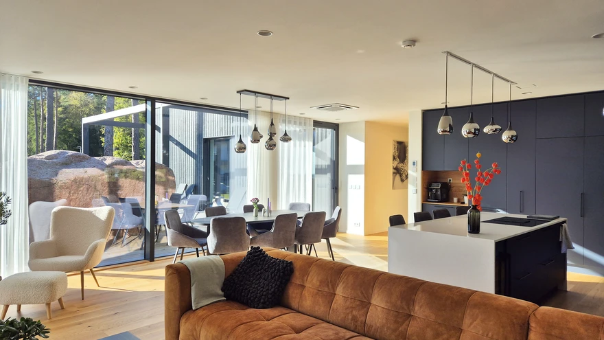 | foto: Priit Grepp„Mida kõrgemaks maja kivi ümber kerkis, seda enam me rahnu armastama hakkasime,” ütleb perekond Asi, kelle Viimsi kodu sai lahendused õuel oleva rändrahnu järgi.