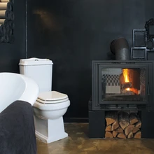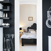 Tahtsin oma ettekujutuses saada vannituppa valkjashalli betoonpõrandat. Aga ehitusmees, kes minu hinnangul oli väga kogenematu, lakkis selle üle tavalise põrandalakiga ning põrand reageeris nii, et läks natuke rohekaks. Tekkis tundlik, kergelt laiguline pind, pakun, et see värvitoon võiks olla vana kuld. Ehitaja oma kogenematuses andis ehk puuduva nüansi. Olin algul pettunud, aga nüüd näen seda värske pilguga. Alguses oli ka mõeldud, et teen vannitoas olevale kaminale kesta ümber, aga praegu meeldib ta mulle just nii: rustikaalne, paljas kaminasüdamik mustaks värvitud seina taustal. Ainuke asi, mida planeeringus muuta ei saanud, oli magamistoa seina asukoht,sest see on paks, kandev paekivi sein. Mure oli, kuidas uksed hakkavad avanema, ning tulime magamistoale ja vannitoale sobivate lükanduste mõttepeale.