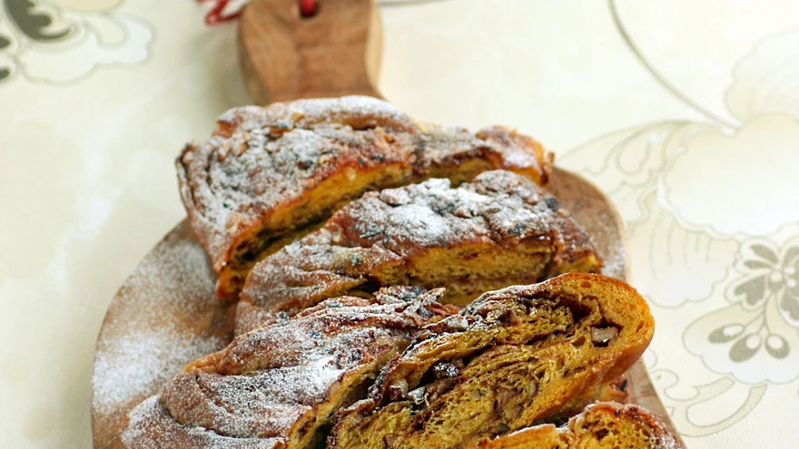 Määri pehme või tainale, puista peale kaneeliga segatud suhkur ja hakitud sarapuupähklid. Lõika tainaplaat pooleks, keera kumbki pool pikemast servast rulli ning tee rullidesse läbi kahe tainakihi sisselõige (põhjani läbi lõikamata). Põimi seejärel rullid palmikuks ja vormi kringliks või pärjaks. Lase kringlil rätiku all pool tundi kerkida, seejärel määri lahtiklopitud munaga ja küpseta 200-kraadises (pöördõhu kasutamisel 190-kraadises) ahjus umbes 25 minutit. Võta kringel ahjust, pintselda üle sulatatud võiga ning puista peale tuhksuhkrut.