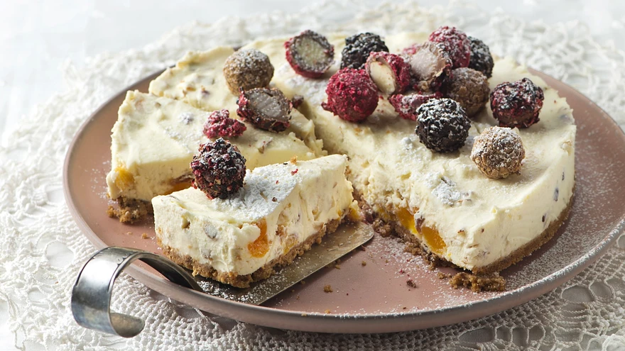 Mikserda toorjuust ja kohupiim kohevaks, mikserda hulka šokolaadi-kooresegu. Sega hulka jõhvikad, rosinad, mandlid ja aprikoosid. Vala segu vormi ja tasanda pealt siledaks.