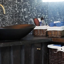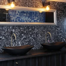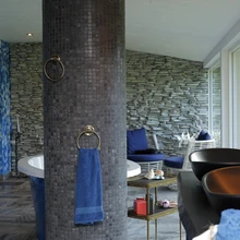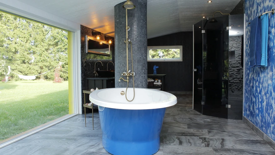 Ehitustööd tegid asjatundjad, kuid pererahvas otsis välja ning tõi koju meelepärased materjalid. Näiteks väikesed kivid, mis viimistlevad ruumi ühte seina, suure sinise vanni ja kõik muu.