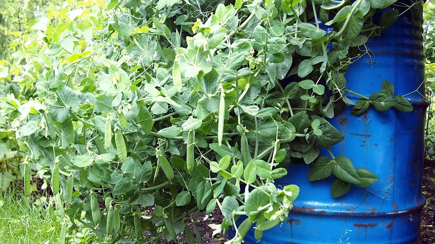 Hernes tünnis. | foto: Jüri AnnistSuured tünnid lopsaka köögiviljaga on aias vahvad pilgupüüdjad. Samas teeb see ka elu lihtsamaks: herneid ja aedube ei pea toestama ning teod ei pääse maiustama kabatšokkidega.