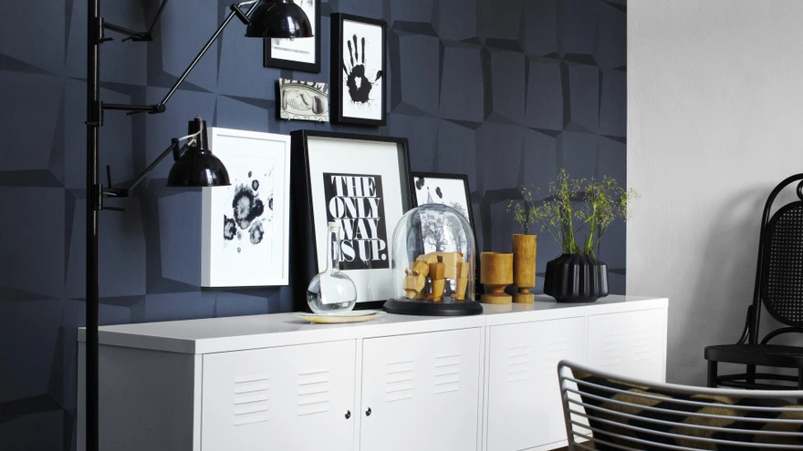 Must-hall-valge värviskeem, millele kolmemõõtmelise mustriga tapeet annab teise hingamise. Mõni väike värvilaik kusagil oleks ehk siiski teretulnud – kas taimede või mõne dekoratiiveseme näol. | foto: PromopiltKuidas tulla elutoas toime värvide ja mustrite virvarriga – mida valida, millest loobuda? Kogenud sisekujundaja Madle Mühlbach juhib samm-sammult üle kodukujunduse salakaride.
