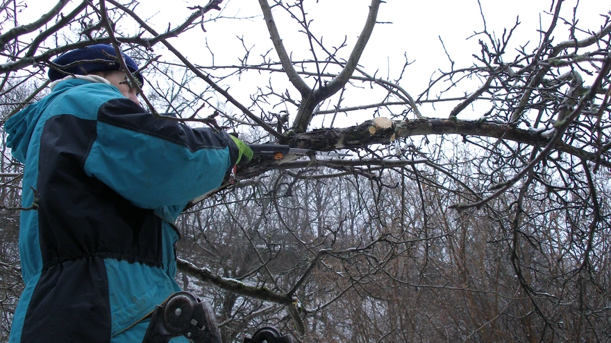 Heledate lõikehaavade järgi on näha, et eemaldatud on jäme püstine oks ja selle juurest kaks kuiva. Nüüd saeb aednik halva kasvusuunaga oksa, seejärel võtab ette sealsamas põhiharul oleva suure püstise. | foto: Kaja KurgPehme ilmaga märtsipäeval on paras aeg teha algust õunapuude lõikamisega.