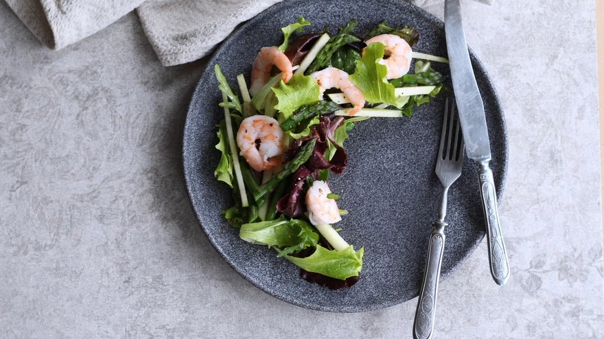 Kreveti-sparglisalat õuntega. | foto: Kristi RebaneKrõmps õun, soolakad krevetid ja värske spargel moodustavad kevadise energiaroa, mis rõõmustab kõhtu ja maitsemeeli. Võimalusel kasuta tooreid koorimata sabadega krevette, kuid sobivad ka keedetud (ehk roosad) krevetid. Kõrvale paku pehmet ciabatta’t või Gruusia saia.