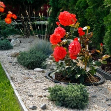 Peenraroosid vajavad aga talveks muldamist ja katmist. Kivimultši sees oleks seda väga tülikas ja aeganõudev teha. „Seetõttu leiutasin oma võtte,” näitab naine oma rakendatud ideed. Taas mindi Espaki poodi ja toodi sealt musti seguämbreid. Nendelt lõigati ülemine serv mõnekümne sentimeetri ulatuses ära, nii et jäid plastvõrud. Roosidele kaevati korraliku mullaga istutusaugud, augu servad aga vooderdati ämbritest tehtud võrudega. Nii ei segune kivimultš roosimullaga, kobestada ja väetada on taimi kergem ning samuti ei ole tülikas sügisel mullata ega kevadel mulda eemaldada.