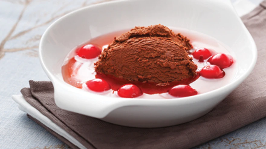 - Serveerimiseks tõsta iga magustoidupokaali sisse suur lusikatäis šokolaadivahtu – kõige lihtsam on seda teha kuuma vette kastetud lusikaga. Kalla jõhvikakissell ümber šokolaadivahu ning kaunista jõhvikatega.