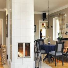 Alumise korruse toapugerike ja köögi asemele on kujundatud voolava ruumina elutuba, mille keskel troonivad korstnajalg ja sihvakas valge kahhelahi „Aino”. „Kuna meil on varasemast kogemusi elutoaga, kus mitte keegi ei käinud, on siin nüüd palju istumiskohti,” selgitab Vilve, osutades lapsepõlvekodust pärit 1960. aastate tugitoolidele ja Pärnu tuttavate käest hangitud vanale sohvale ja toolidele.