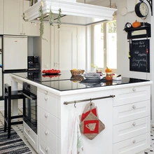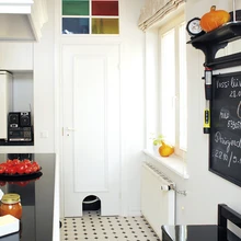 Uut sisustust projekteerides kavandati hulgaliselt panipaiku. Ruumi jäeti ka sahvrile, kus on kass Vassilissa liivakast, loom pääseb sinna oma „uksest”. Keset ruumi paikneb köögisaar, mille tööpind on looduskivist, seinaäärsetel kappidel aga pressgraniidist. Valged köögikapid valmistati firmas Knolle. Toredaid mööblimeistreid hämmastas pererahva 1980. aastast pärit külmkapp Minsk 15”, mis moodustab moodsa mööbliga julge kontrasti.