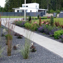 Puhmaste värvid ja kujud moodustavad koheva taimevöö, mis pakub tõelist silmarõõmu. Ja millised võrratud aroomid paiskuvad õhku, kui puhmikuid veidi sasida või näpistada oksake! Taimekast on tehtud Fibo plokkidest, mulda on mõnikümmend sentimeetrit.