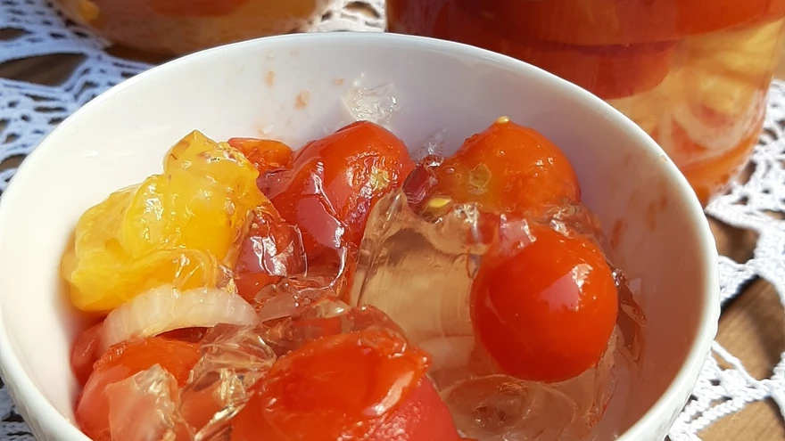 Kui suvemaitselisi tomateid hakkab letšodest üle jääma, on paras aeg valmistada neist koos krõmpsuva sibulaga midagi sellist, mida poeriiulilt suure tõenäosusega ei leia, mis aga on imekaunis ja maitsev peolauaehe. See retsept on jälle minu vanaema varamust. Mäletan, et see oli omal ajal hoidiste kõrgpilotaaž.