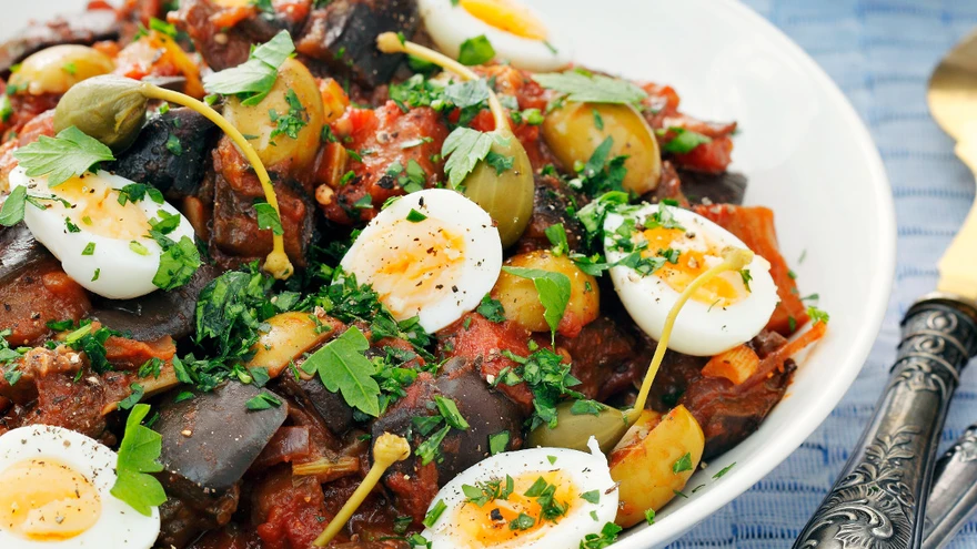 Kuumuta u 5 minutit, timmi maitse parajaks soola, pipra ja/või veiniäädikaga. Tõsta caponata suurele serveerimisvaagnale või madalasse kaussi.