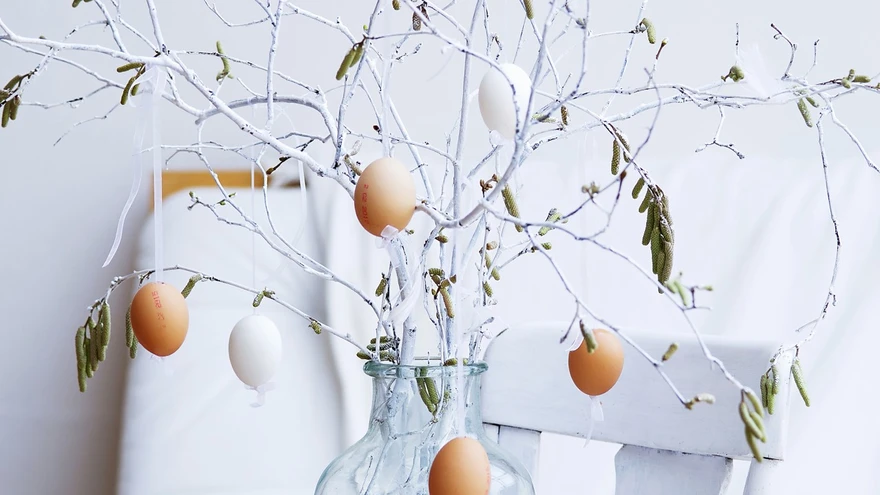 Munadepüha bukett valgeks värvitud okste ja nende külge riputatud munadega. | foto: Alena Hrbkov / Living4media.comLoodushoidlikuma suuna esile tulles jäävad vähem värvikaks ka lihavõttemunad. Grupeerides neid hulgi klaasanumasse või kinnitades okstele, saab toreda seade isegi ilma värvita.