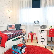 „Toa seinad said viimistluse, mis haakub ülejäänud korteri värvigammaga. Valgel taustal löövad punased ja sinised värvitoonid rõõmsalt särama ning loovad lapsesõbraliku meeleolu. Tapeedimustri valis toa elanik kindla käe ja selge maitsega ise, tehes minu jaoks ülejäänud töö palju lihtsamaks. Lae liigendamine andis võimaluse varjatud valgusallikaga üldvalgustuse kasutamiseks, mis loob ka kõrgema ruumi illusiooni. Koolilaua kohal ja voodi otste juures on funktsionaalsed valgustid õppimiseks ja raamatute lugemiseks. Pimendav ruloo aitab valgete ööde perioodil paremini välja puhata ja unetunde juurde võita.